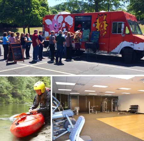 A weekly food truck service provides quick, inexpensive food favorites right outside.
